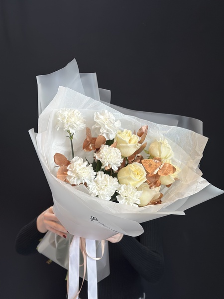 Букет из белых гвоздик, роз и золотого эвкалипта