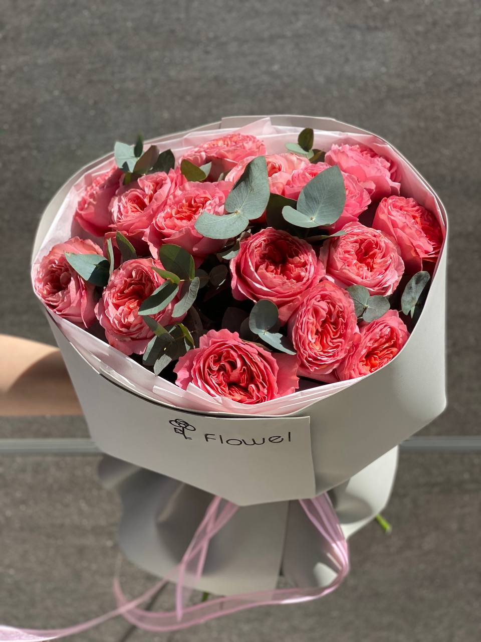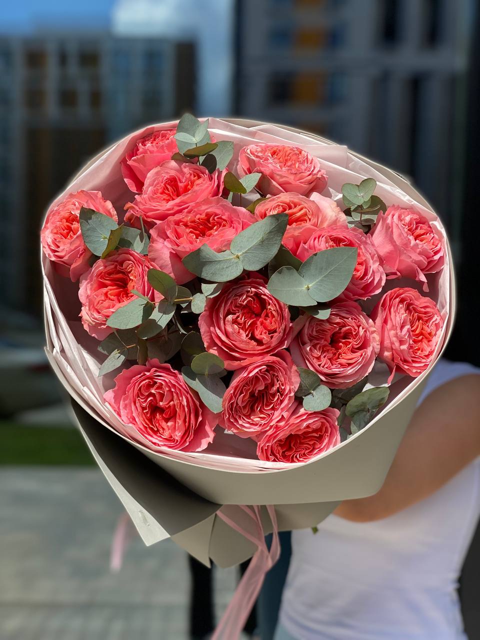15 пионовидных роз с эвкалиптом
