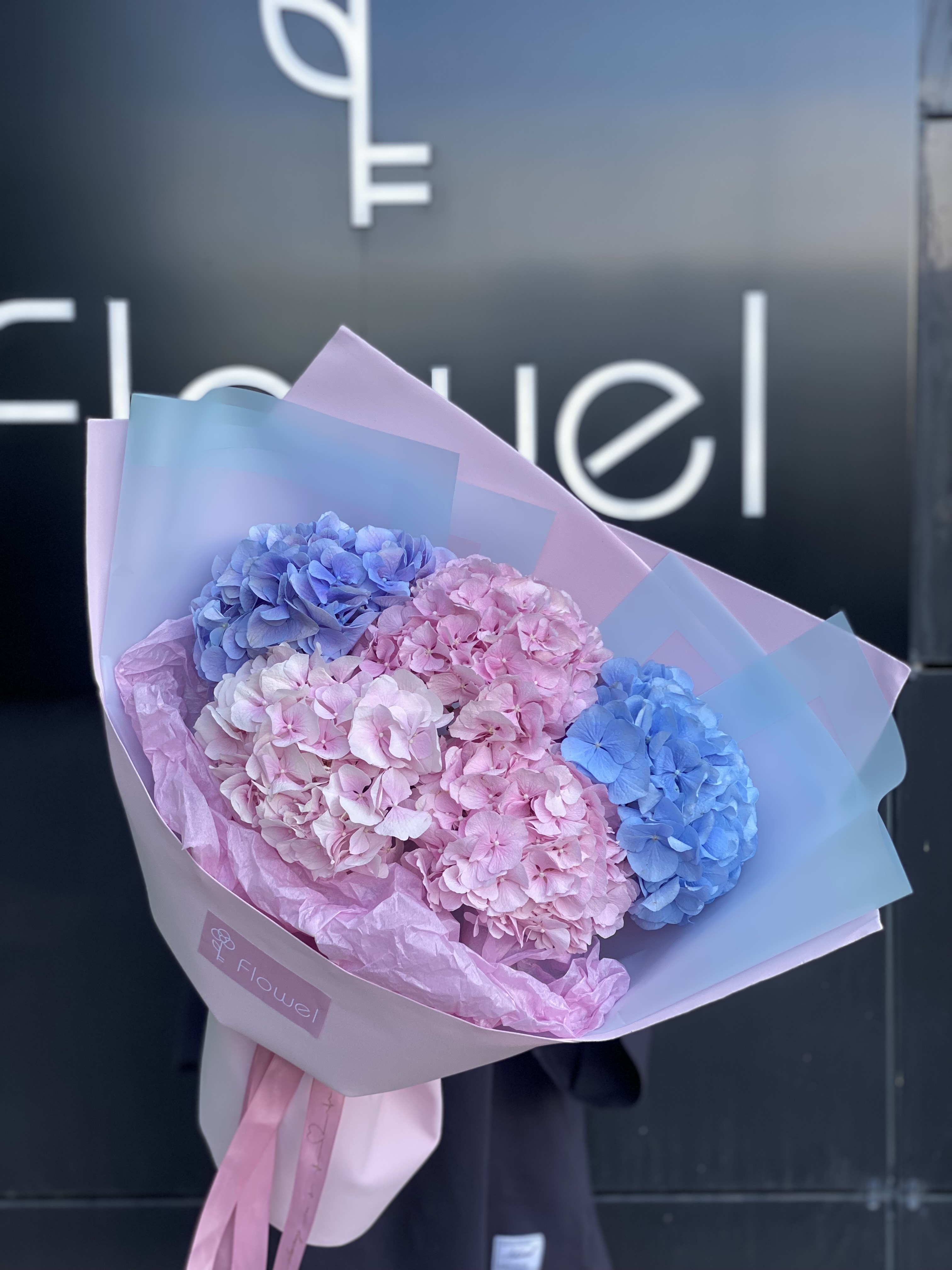 Есть цвета, которые созданы друг для друга. Розовый и голубой — именно такая пара. В природе это сочетание встречается редко — только на рассвете, когда небо только начинает розоветь, но ещё хранит ночную синеву. Мы попытались поймать это мгновение и запечатлеть его в композиции из пяти гортензий.