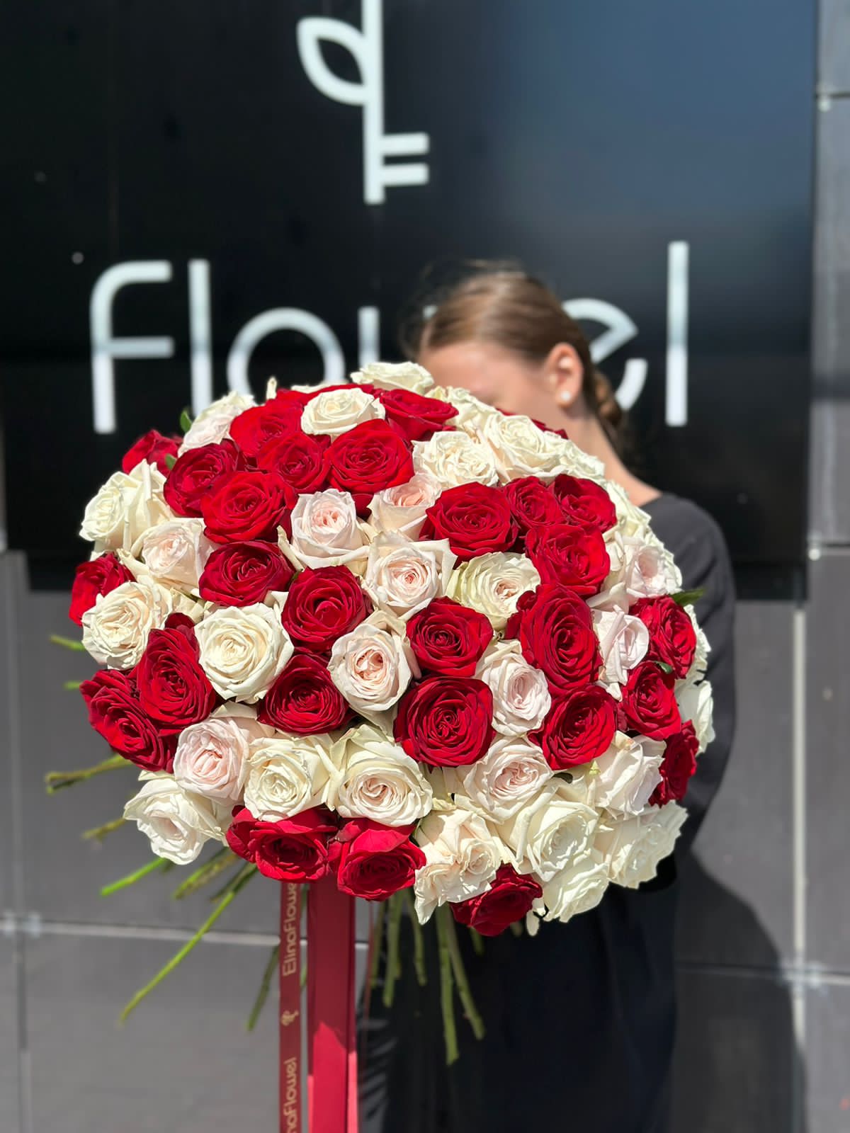 Красные розы и белые розы живут в разных оранжереях, на разных континентах, у разных фермеров. В природе они встречаются редко. В этом букете они встретились.