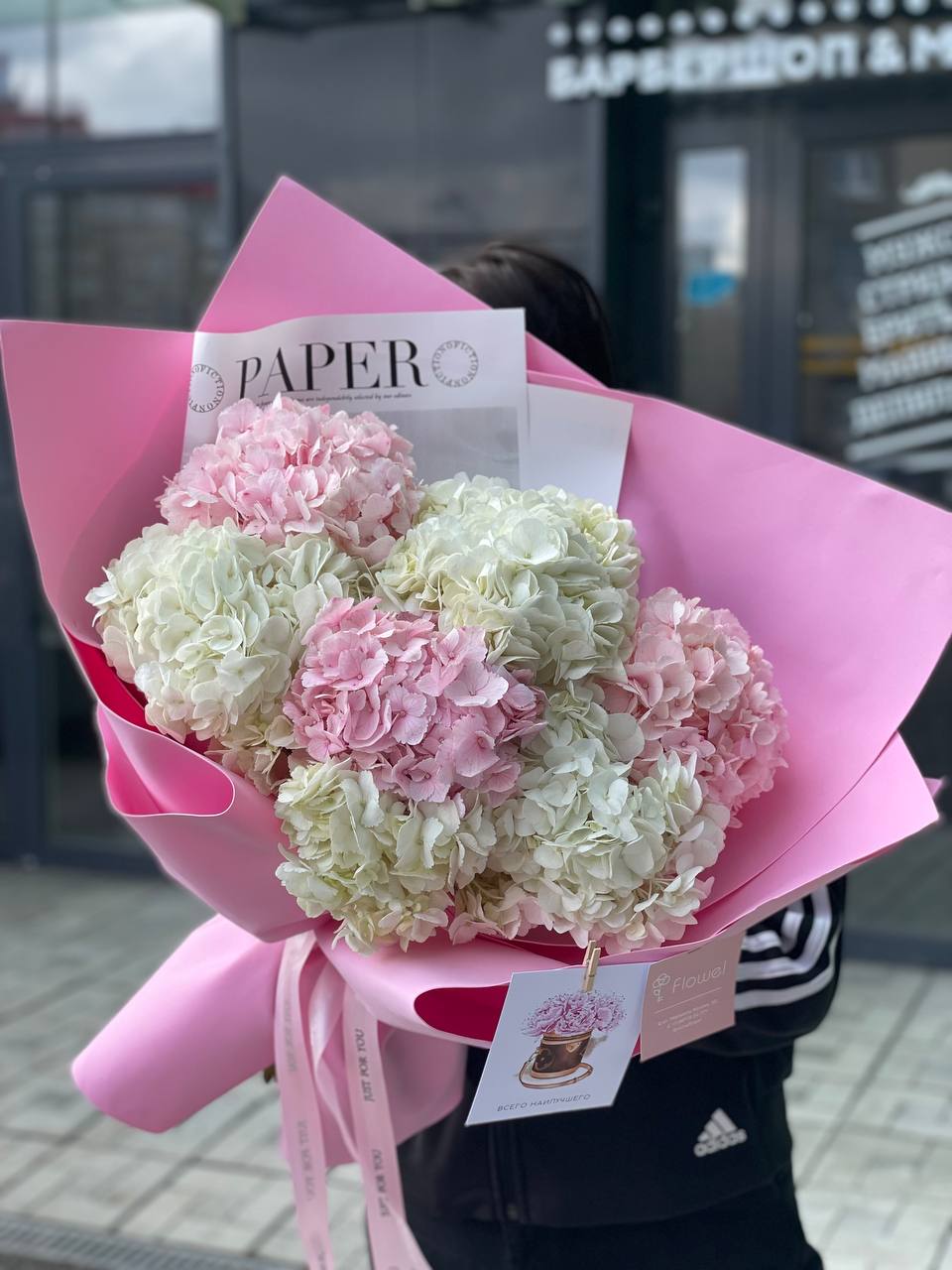 Гортензия — один из самых удивительных и благородных цветов. Её крупные, шаровидные соцветия, состоящие из сотен мелких цветков, завораживают своей сложной, кружевной текстурой и богатством оттенков. Она символизирует искренность, благодарность и глубину чувств . Букет «7 облаков нежности» объединяет эту красоту с числом 7, которое во многих культурах означает гармонию, завершённость и совершенство .