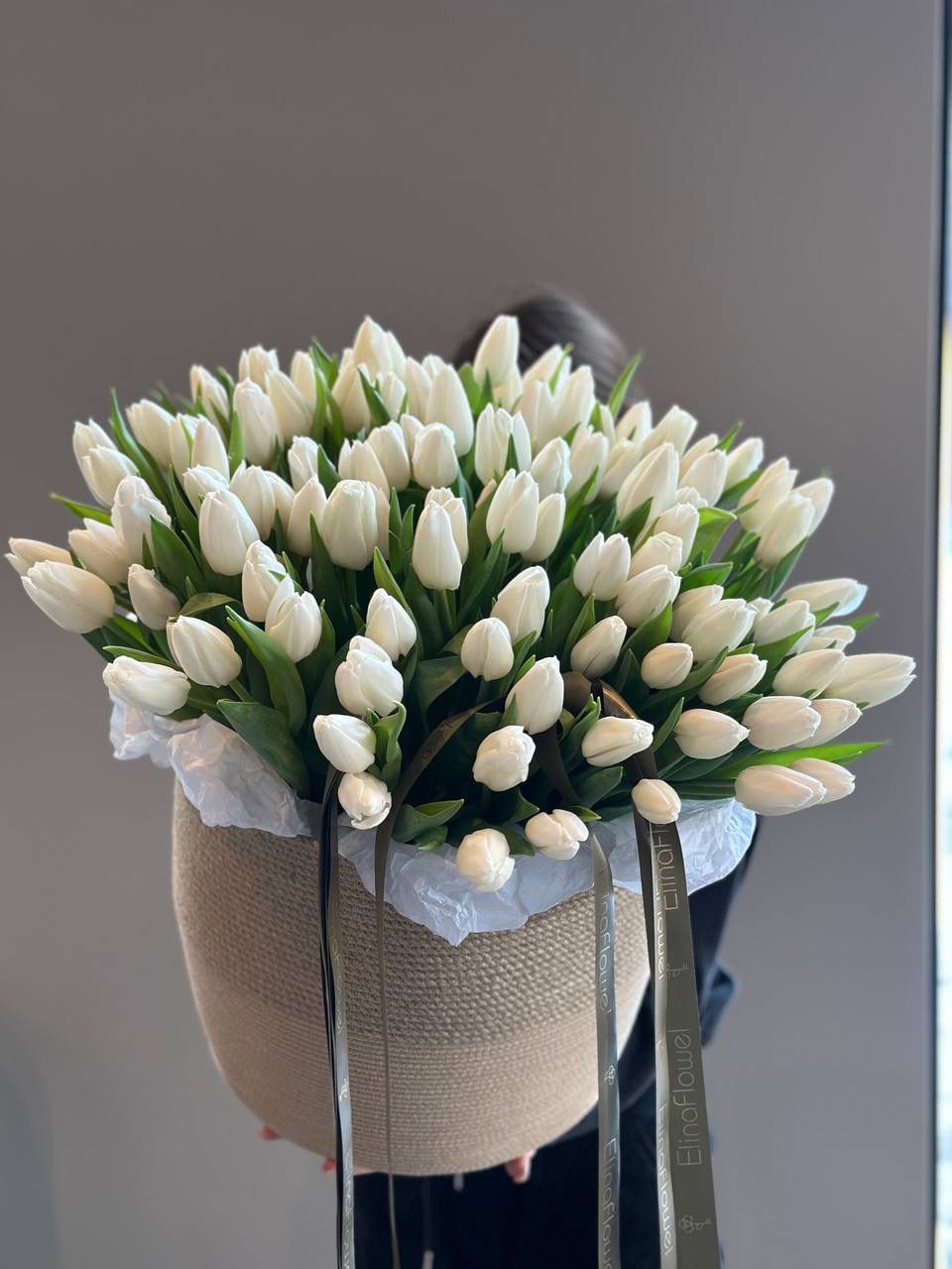 Белые тюльпаны — это воплощение чистоты, нежности и искренности. Их белоснежные бутоны символизируют новую жизнь, светлые помыслы и глубокие, честные чувства . Композиция «85 белоснежных облаков» — это грандиозный, величественный жест, предназначенный для самой важной женщины в вашей жизни. Восемьдесят пять тюльпанов — это масштаб, который говорит сам за себя. Это признание в любви, которое невозможно не заметить, и восхищение, кот