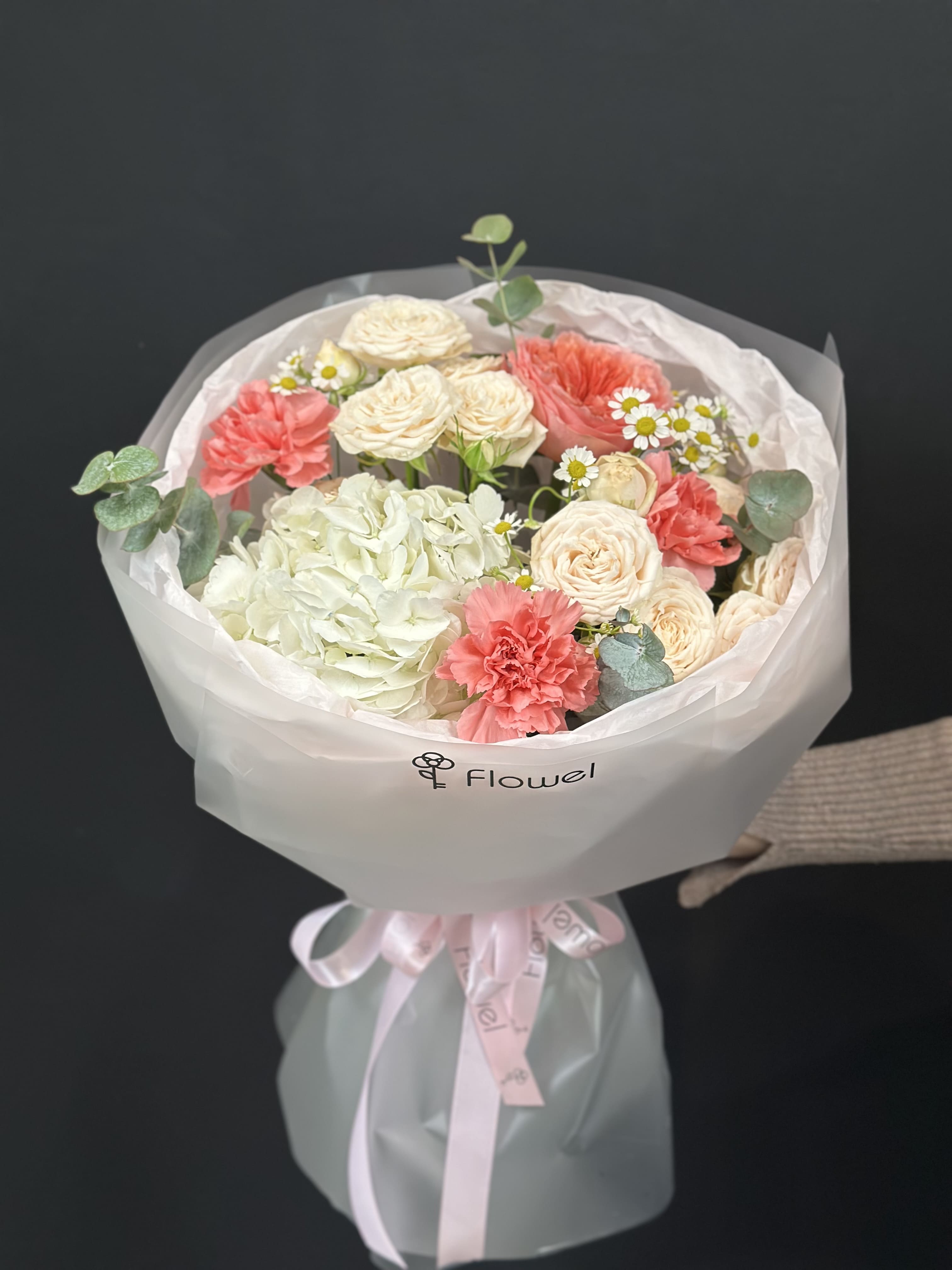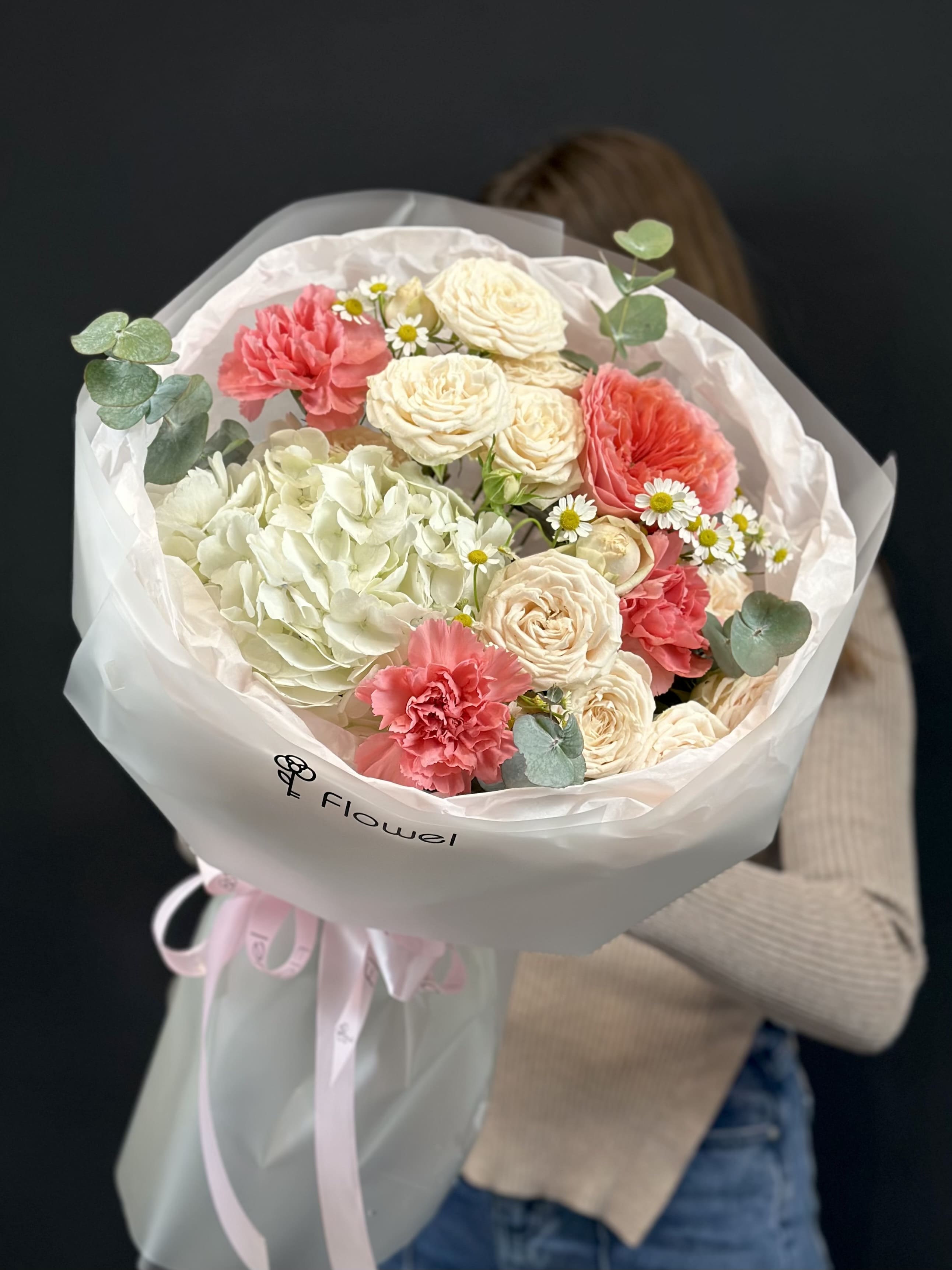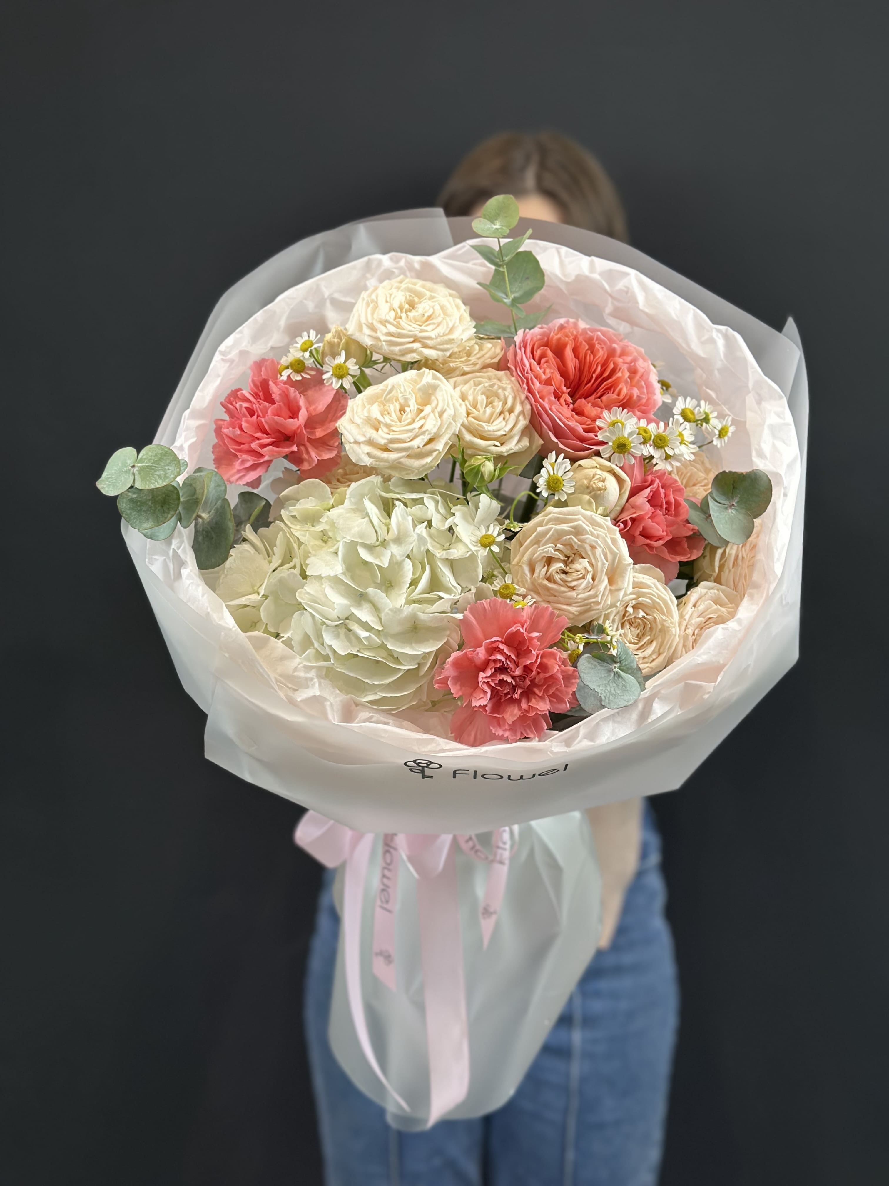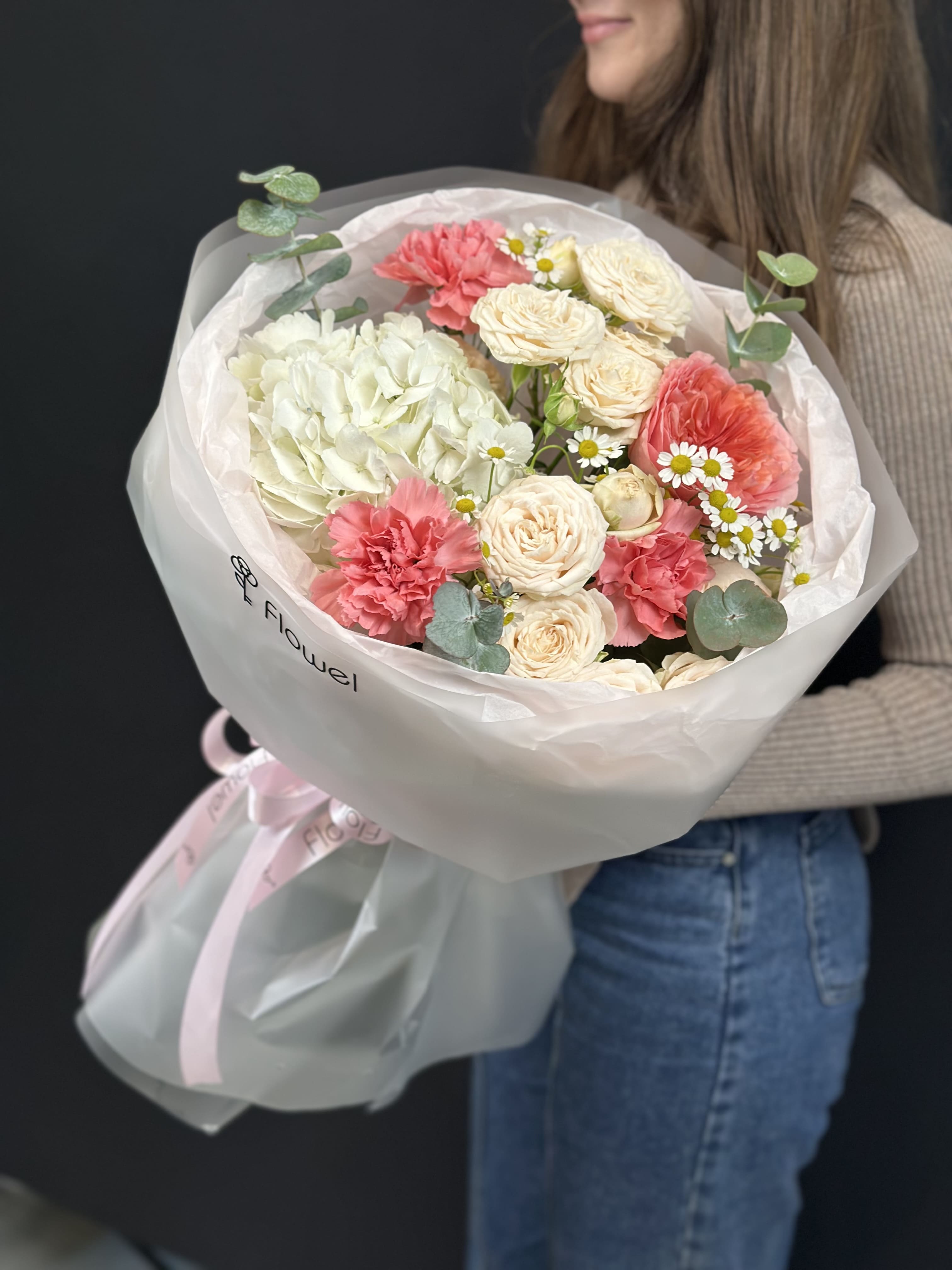 Букет из кустовых и одноголовых роз, гвоздик, ромашек и гортензии