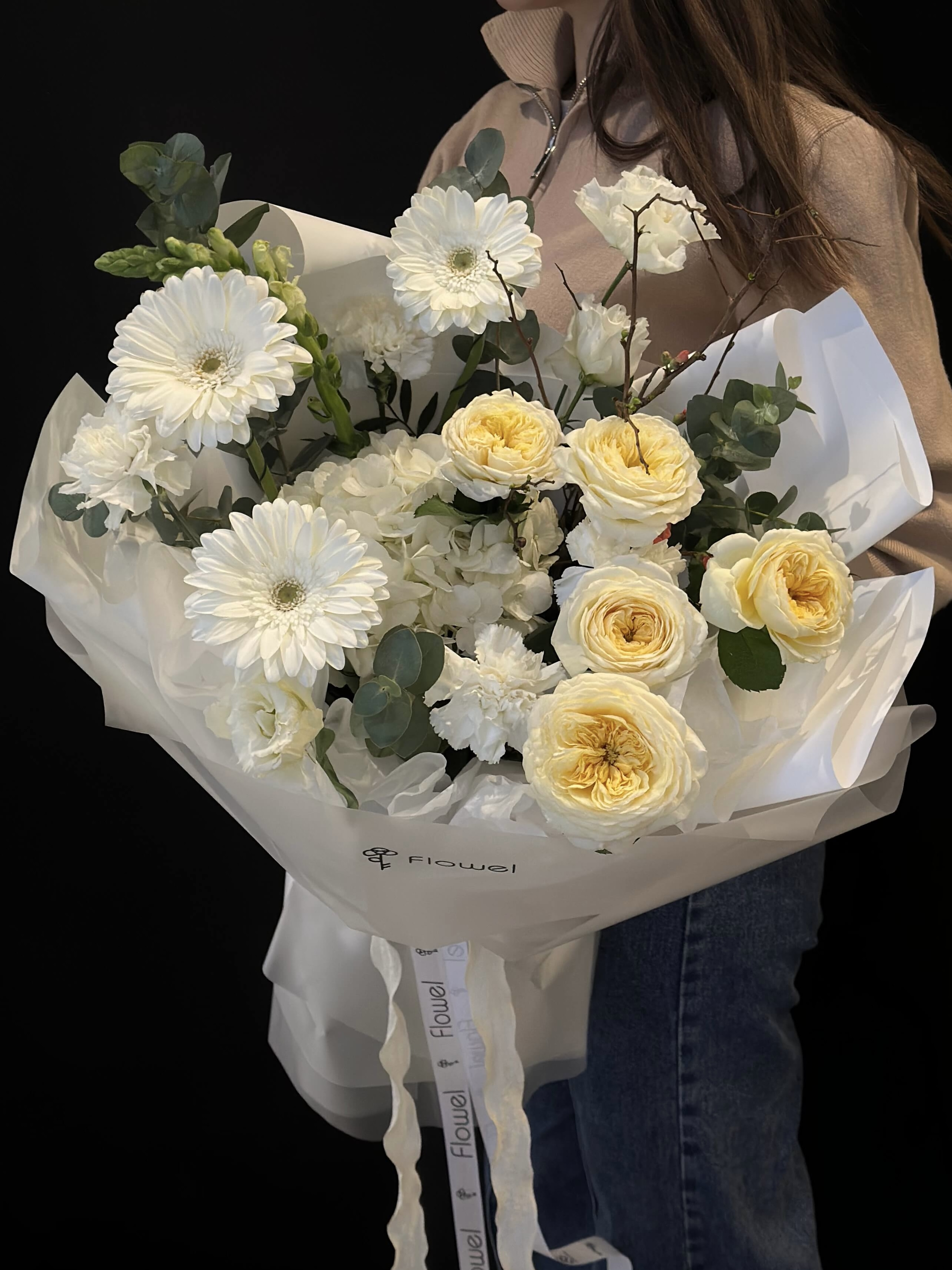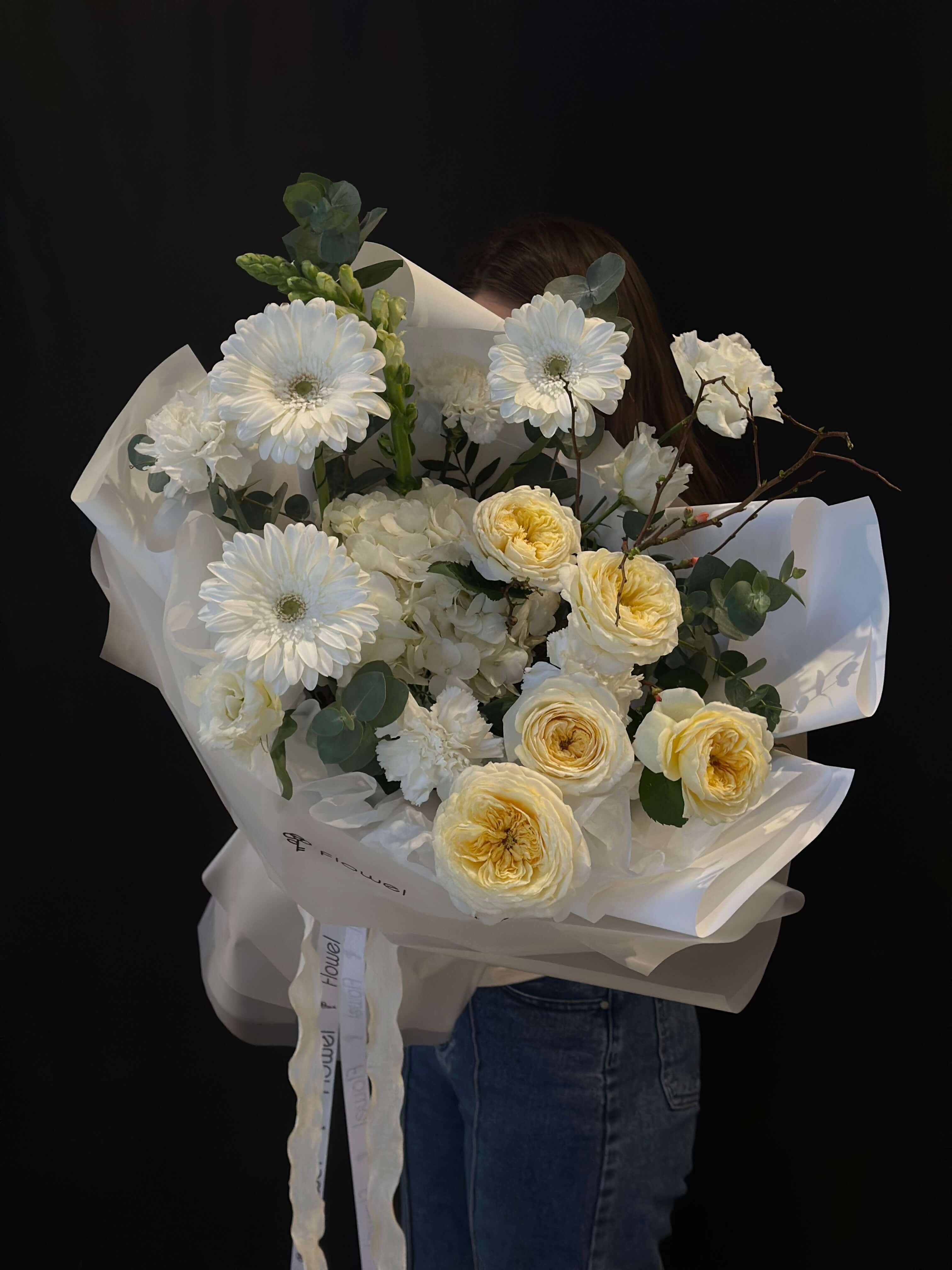 Этот букет создан для тех, кто ищет в цветах не только красоту, но и идею, структуру, художественный замысел. «Архитектурный сад» раздвигает границы привычного, превращая природные формы в элементы дизайна. Здесь ветка магнолии — не просто зелень, а главная линия, несущая конструкция, задающая динамику и масштаб.