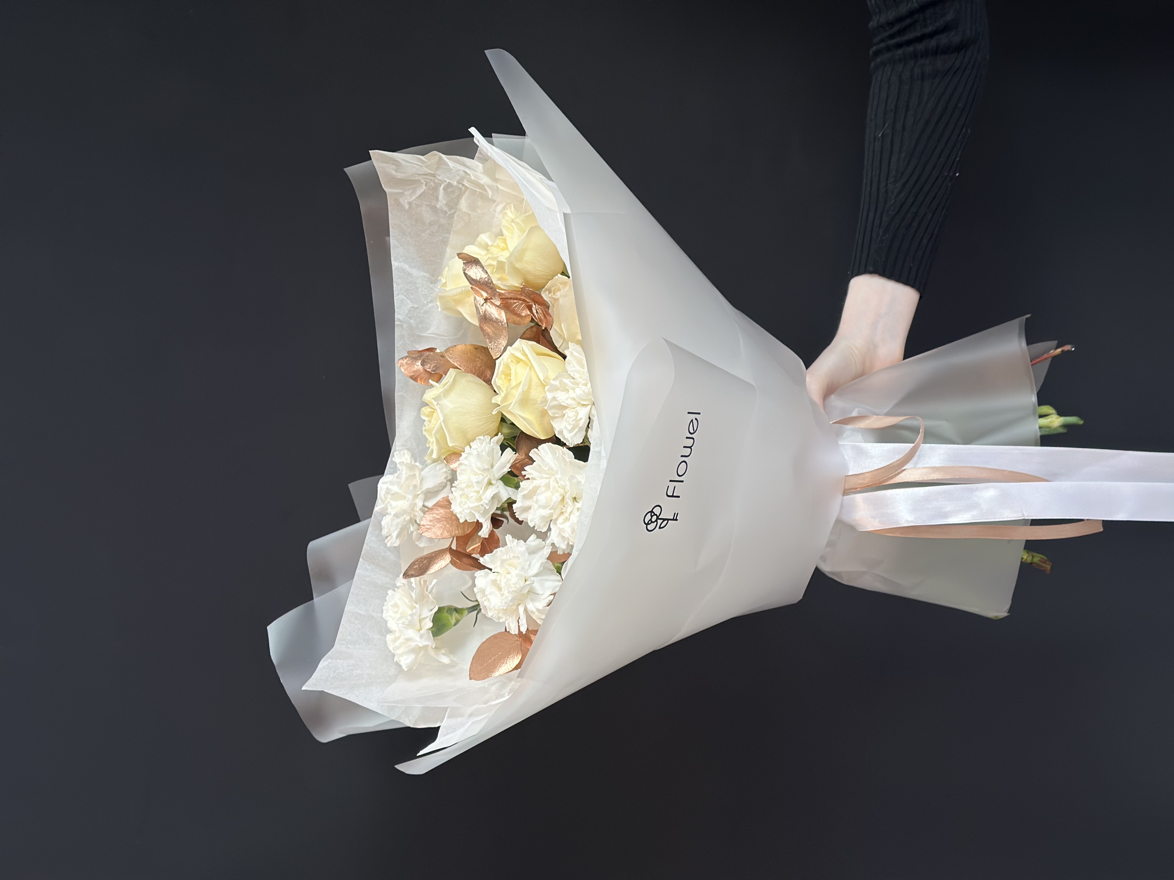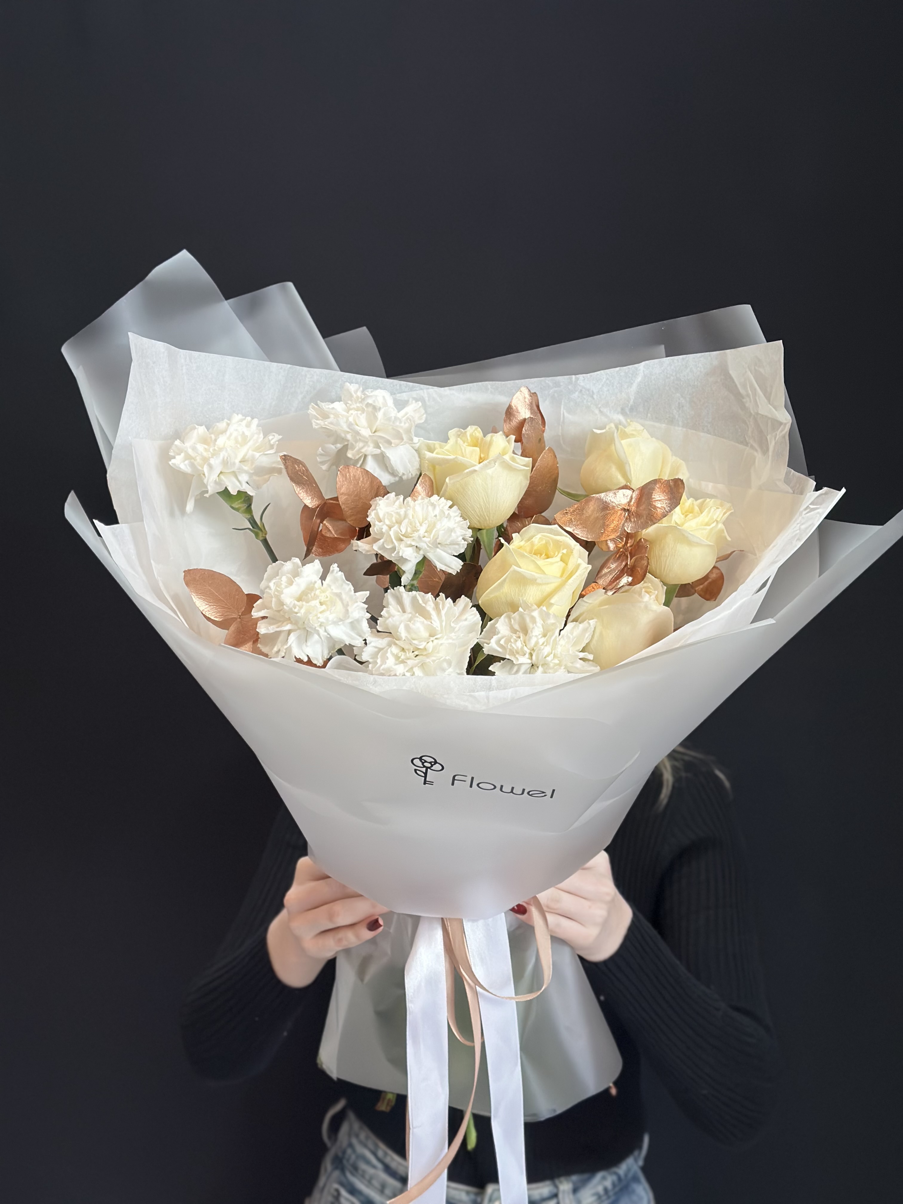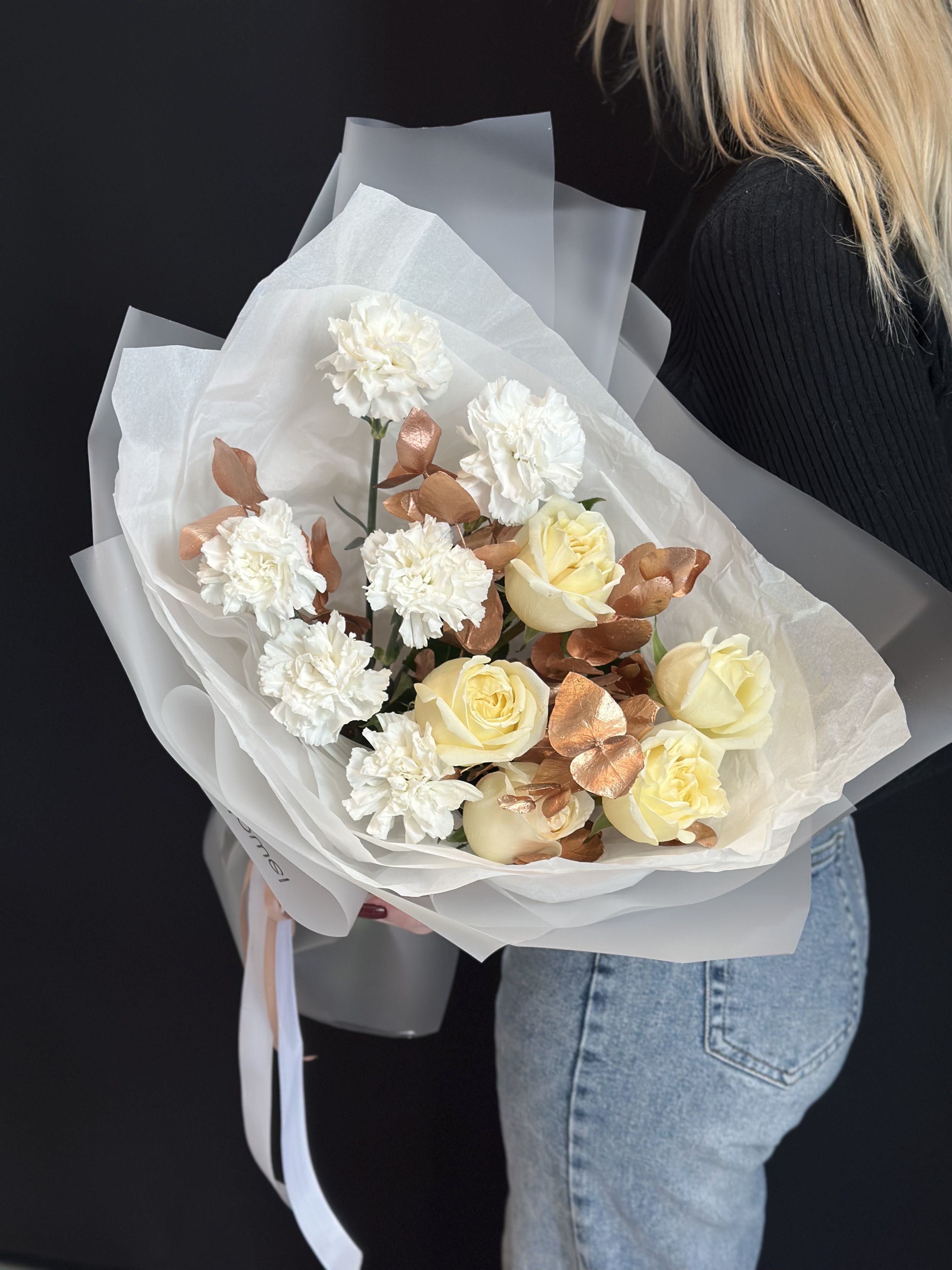Букет из белых гвоздик, роз и золотого эвкалипта
