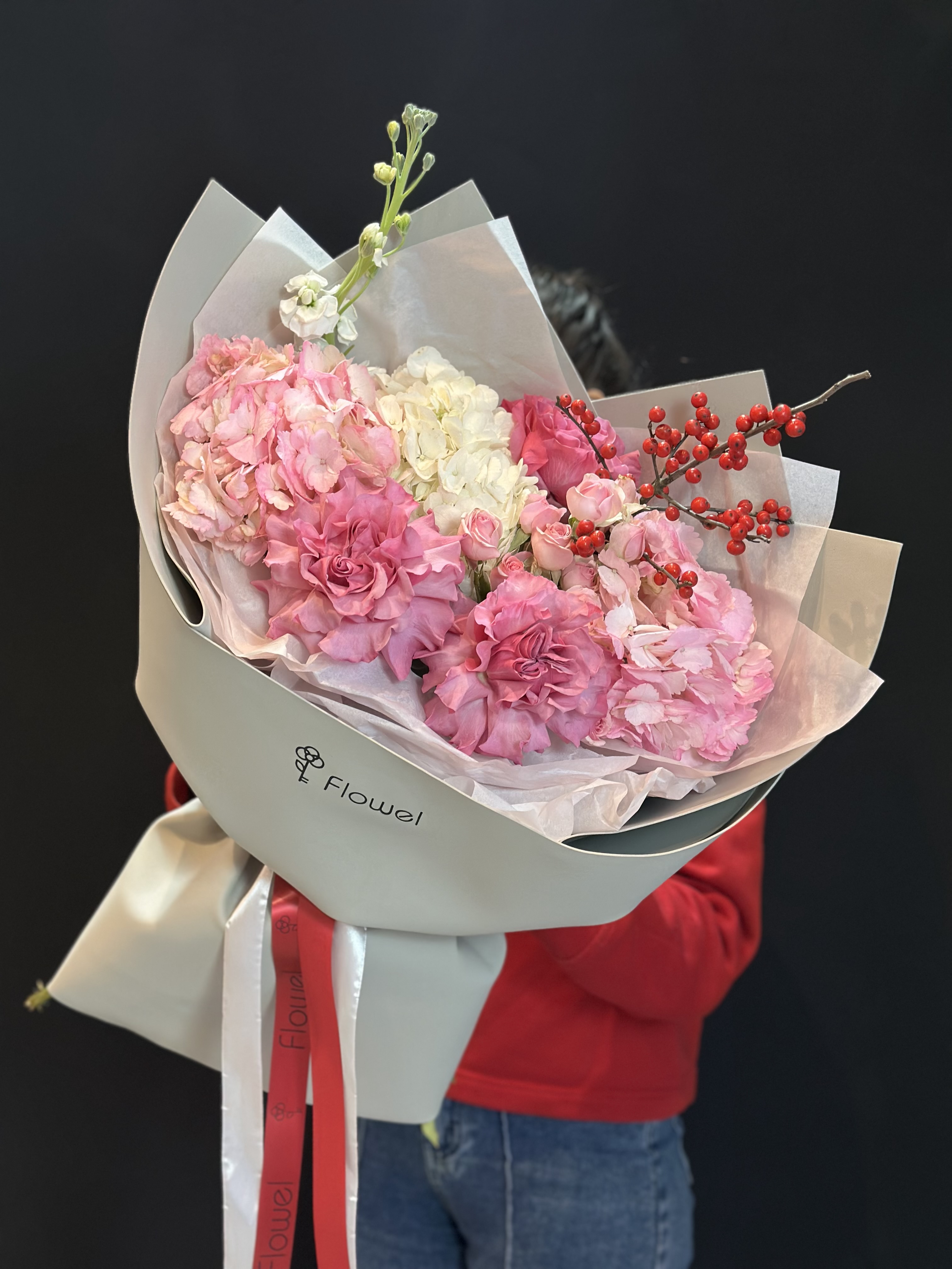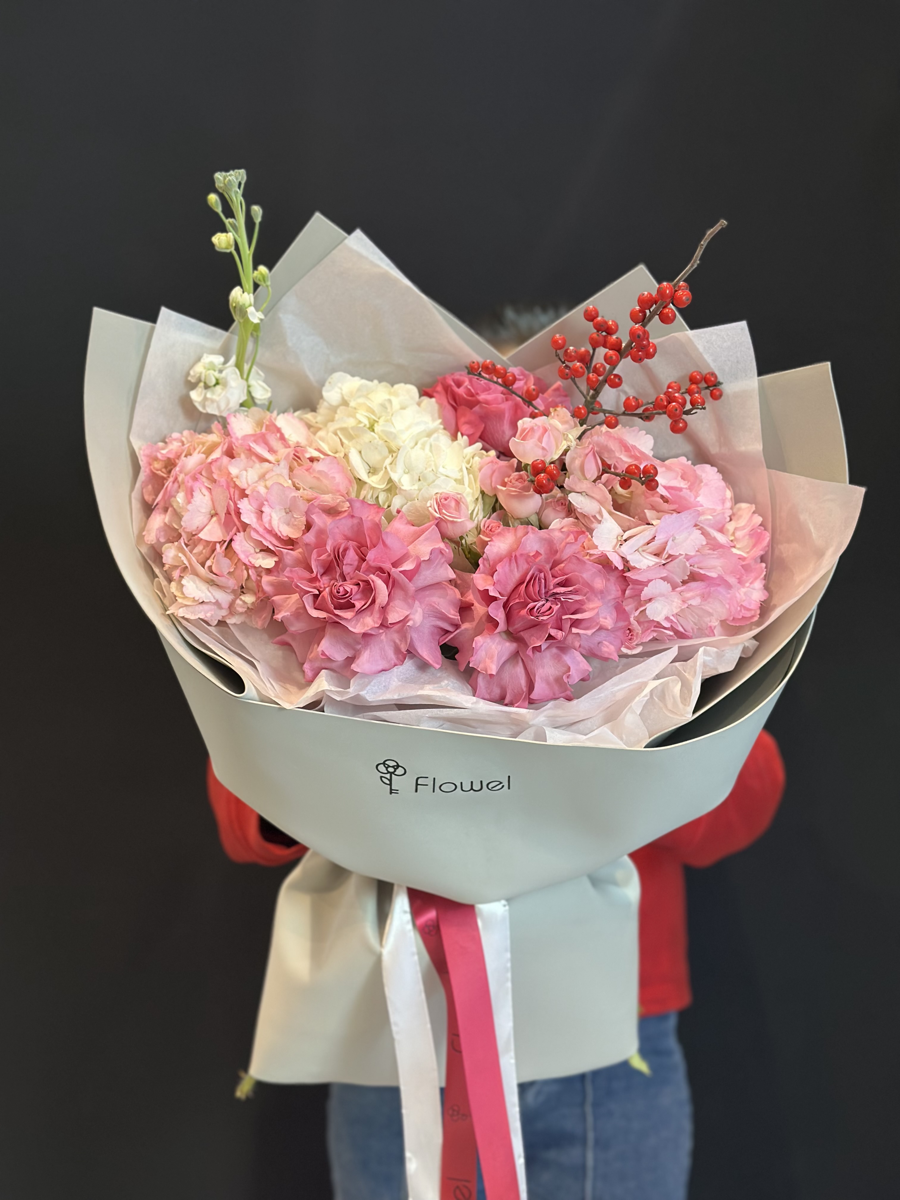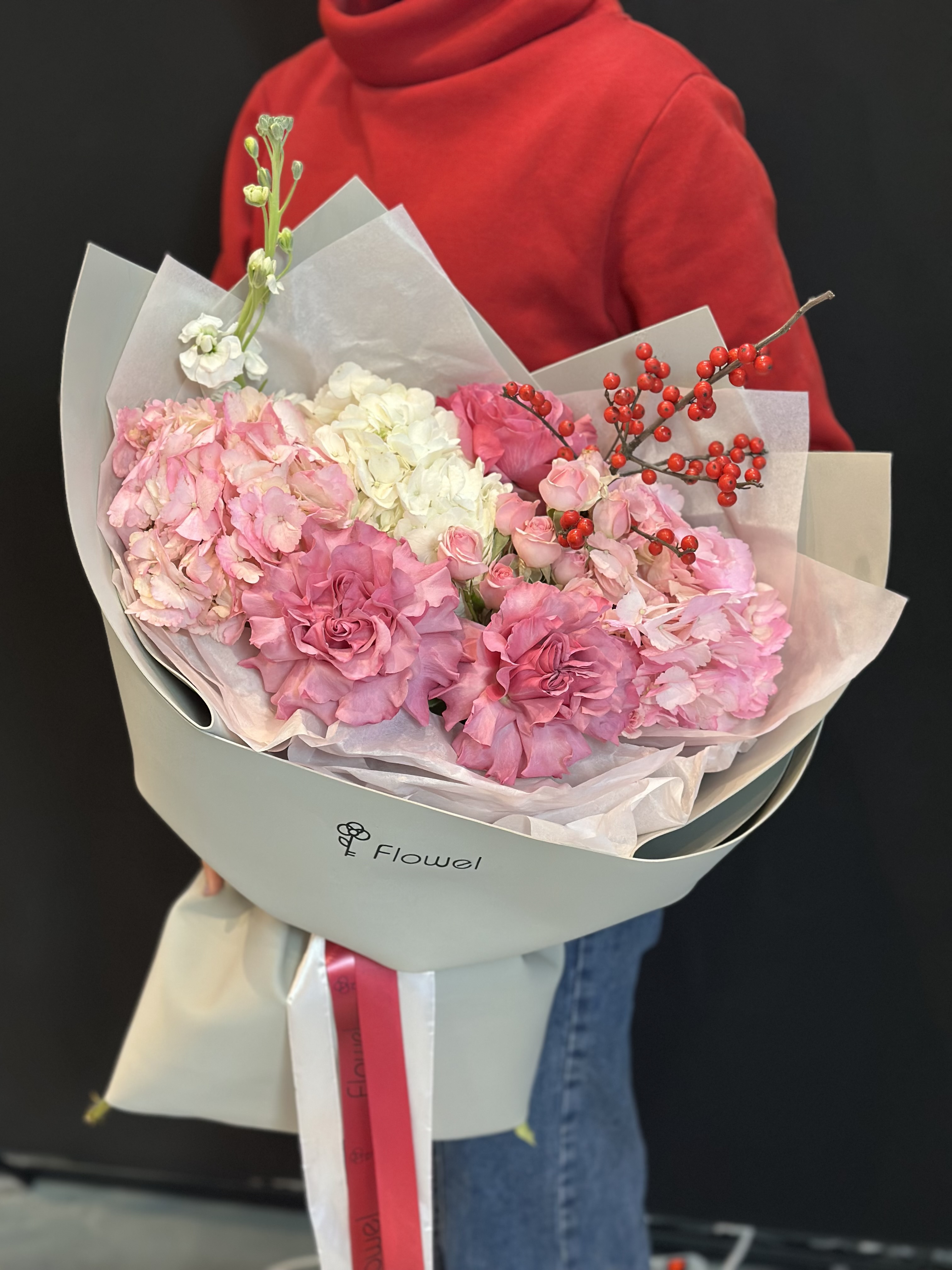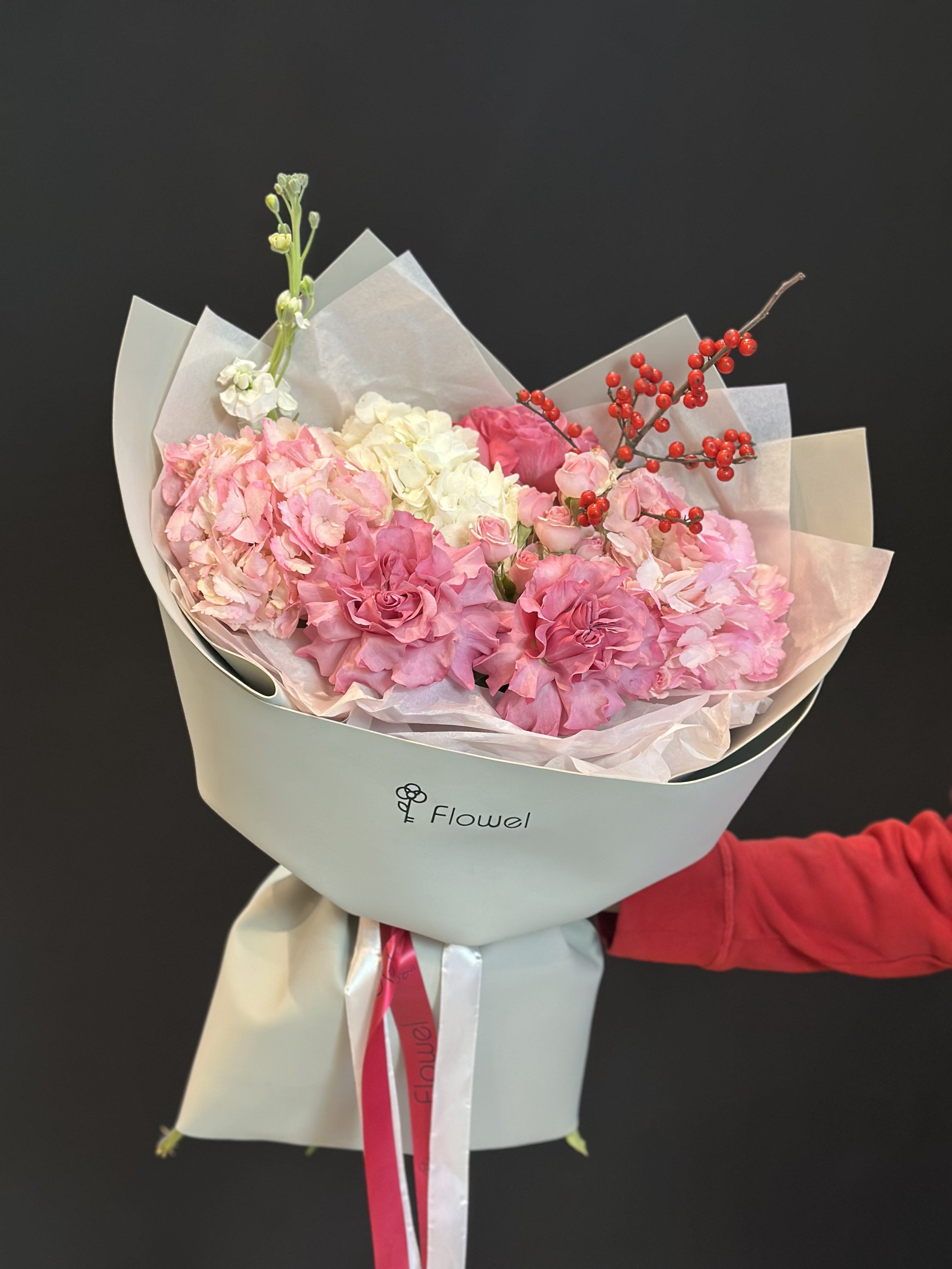 Букет из гортензии, роз, Илекса и Матиоллы