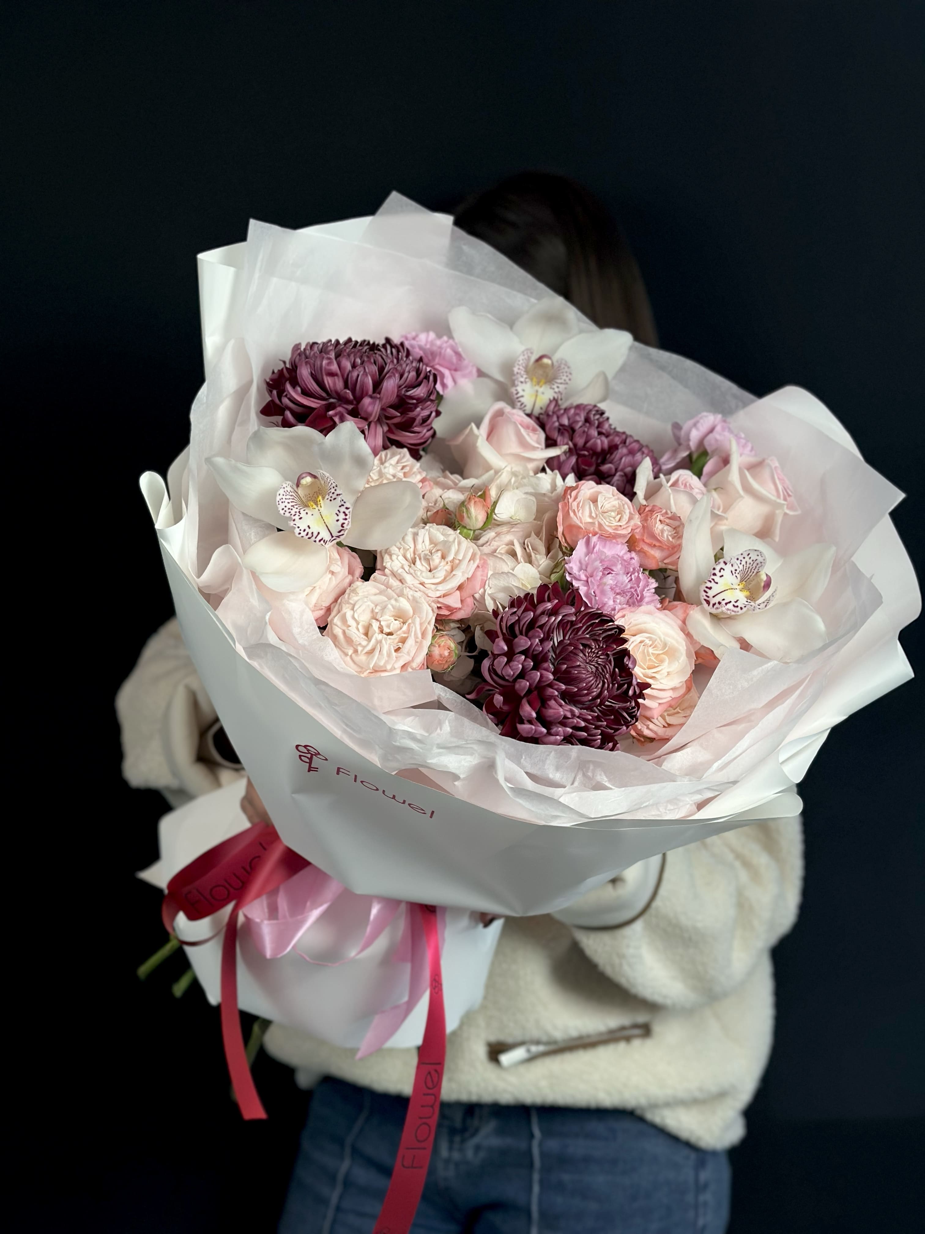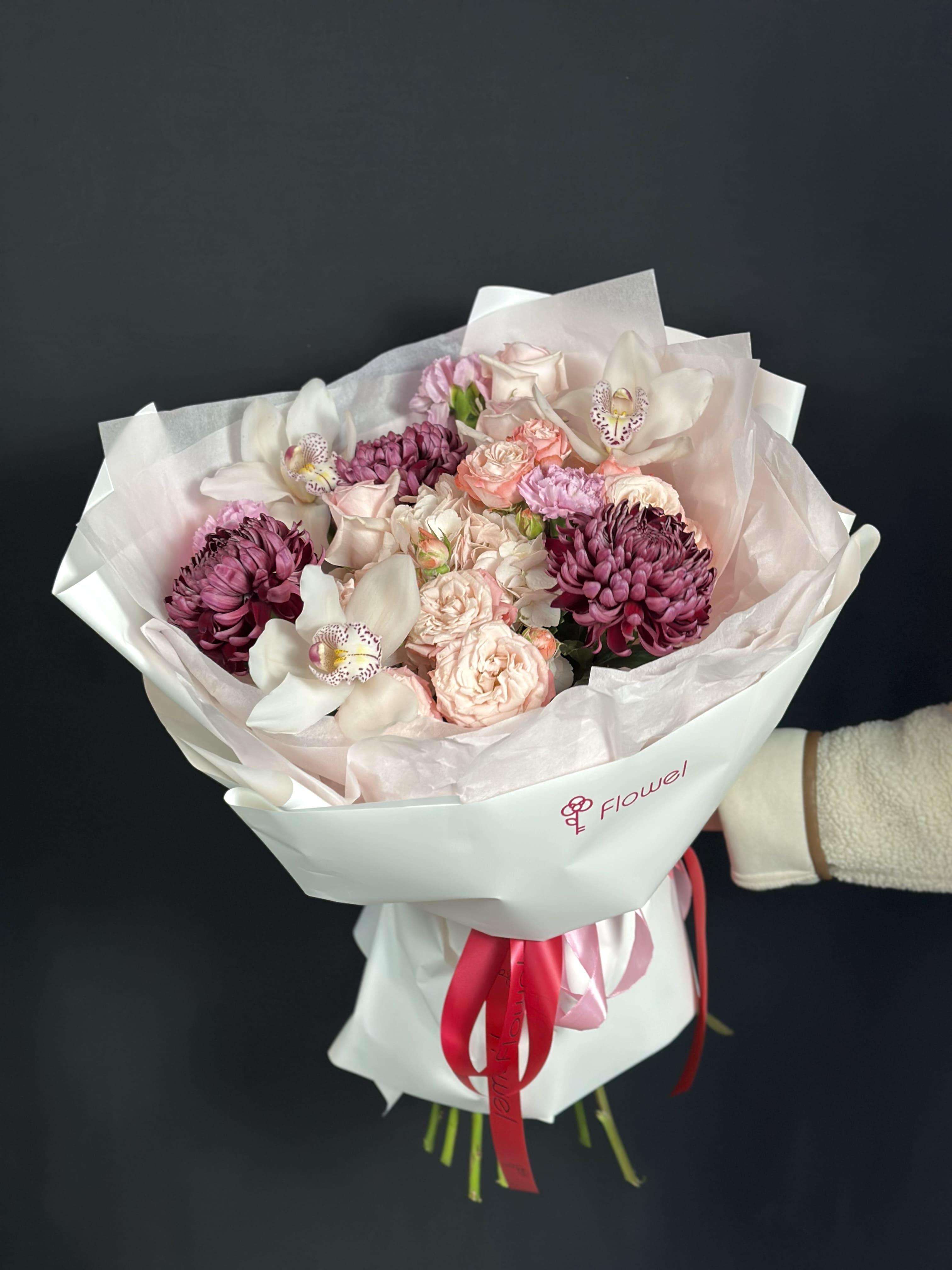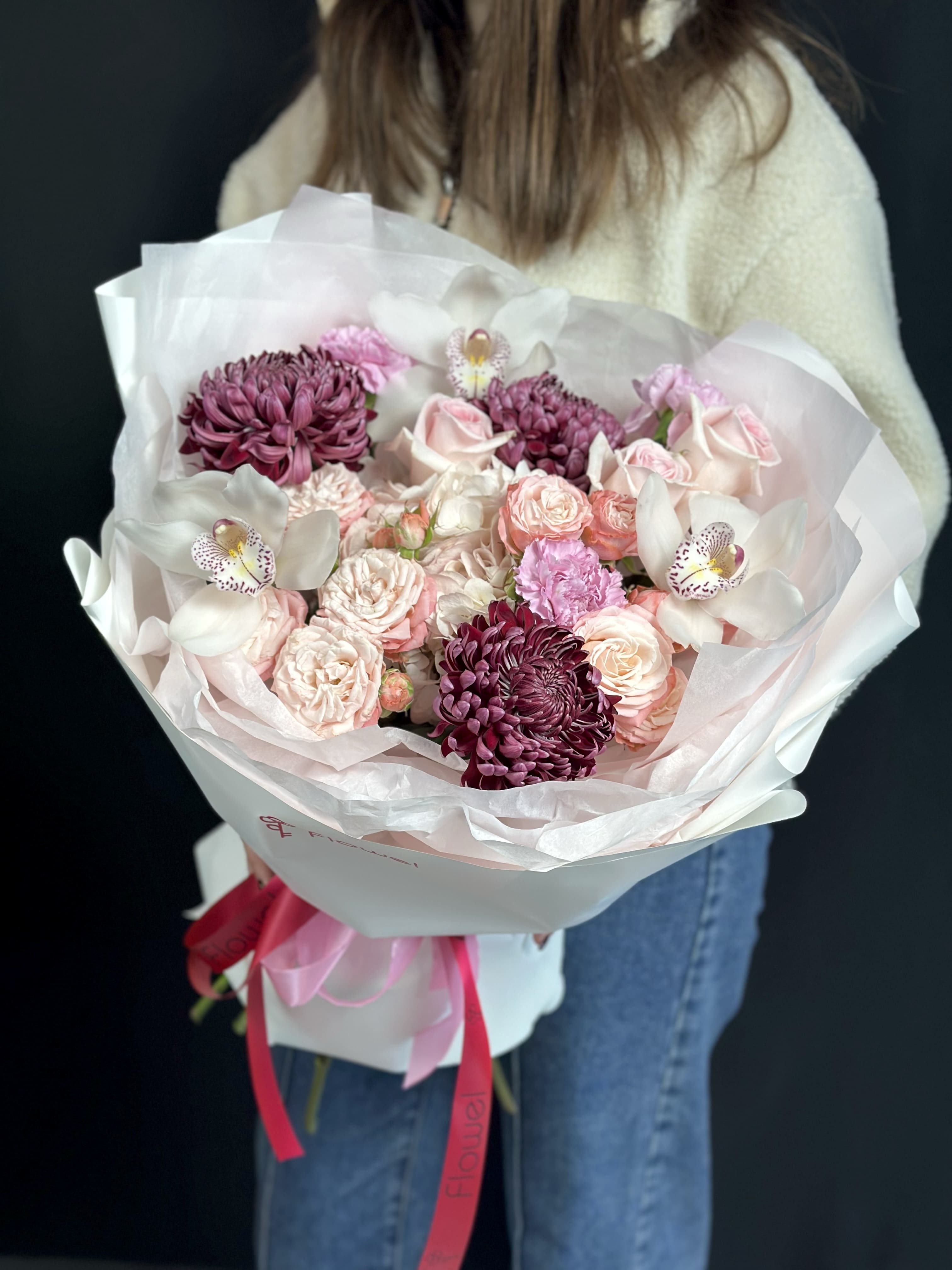Букет из орхидей, кустовых роз, хризантем бигуди и гвоздик