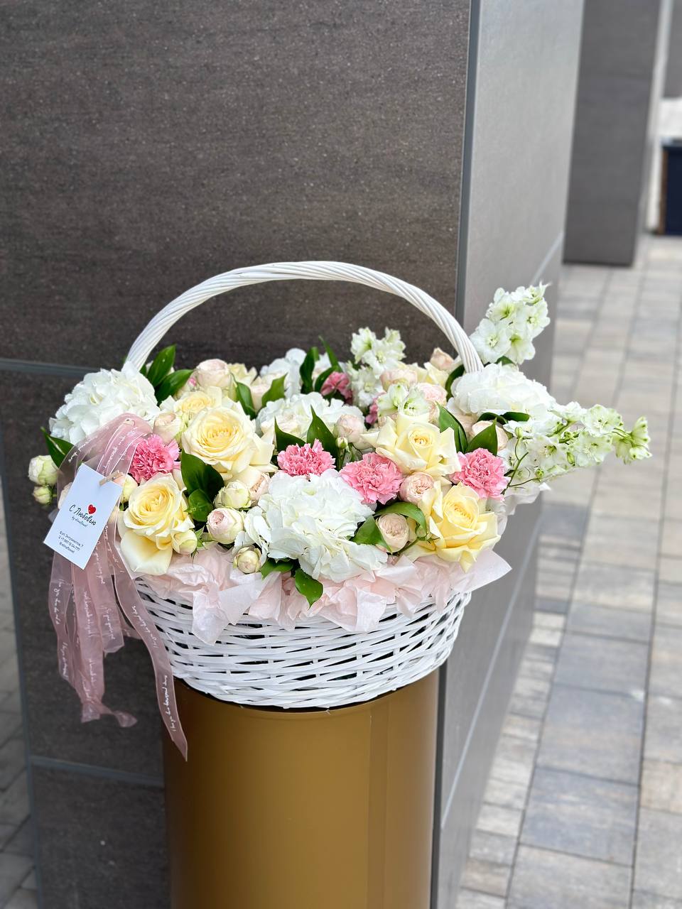Этот букет кажется не собранным, а написанным — широкими мазками гортензии, тонкими линиями дельфиниума, чёткими пятнами роз и яркими точками гвоздик. «Летняя фреска» — это воплощение живого, дышащего пейзажа в формате флористической композиции. Он создан для тех, кто ценит в цветах не только символизм, но и их чисто художественную, декоративную ценность, способность создавать настроение одним своим видом.