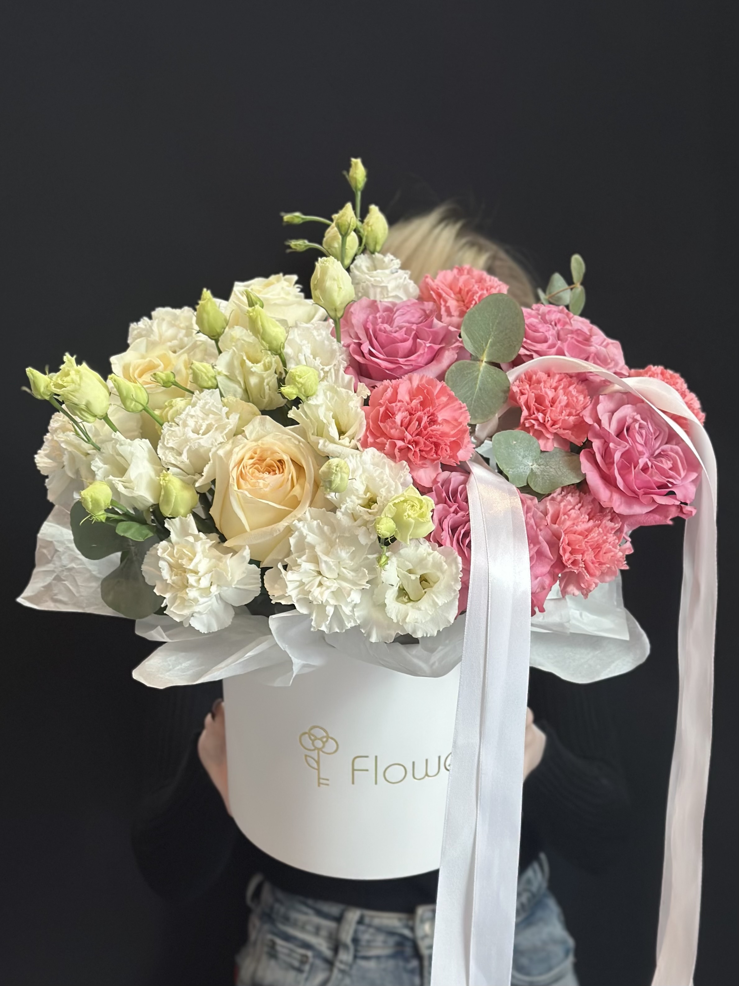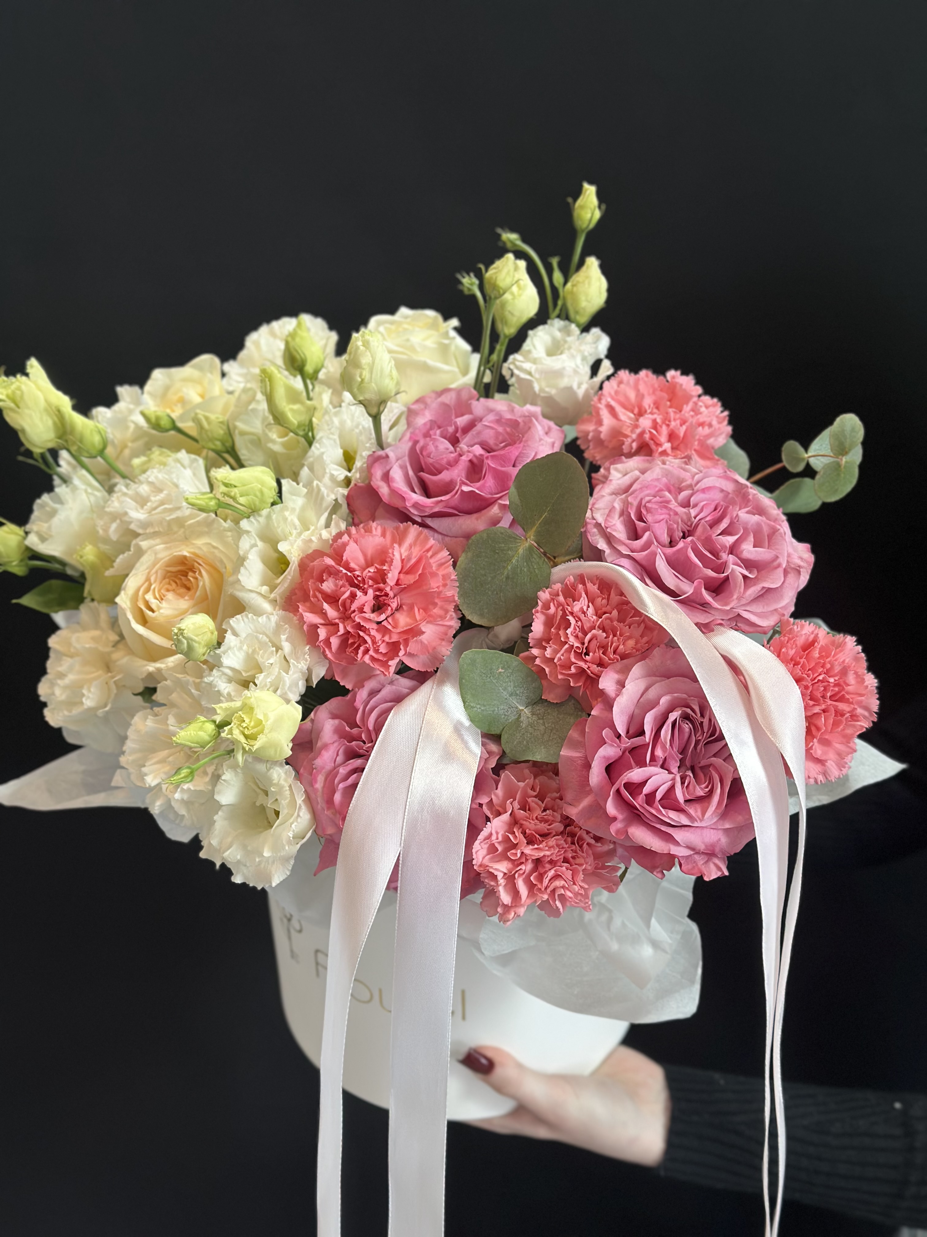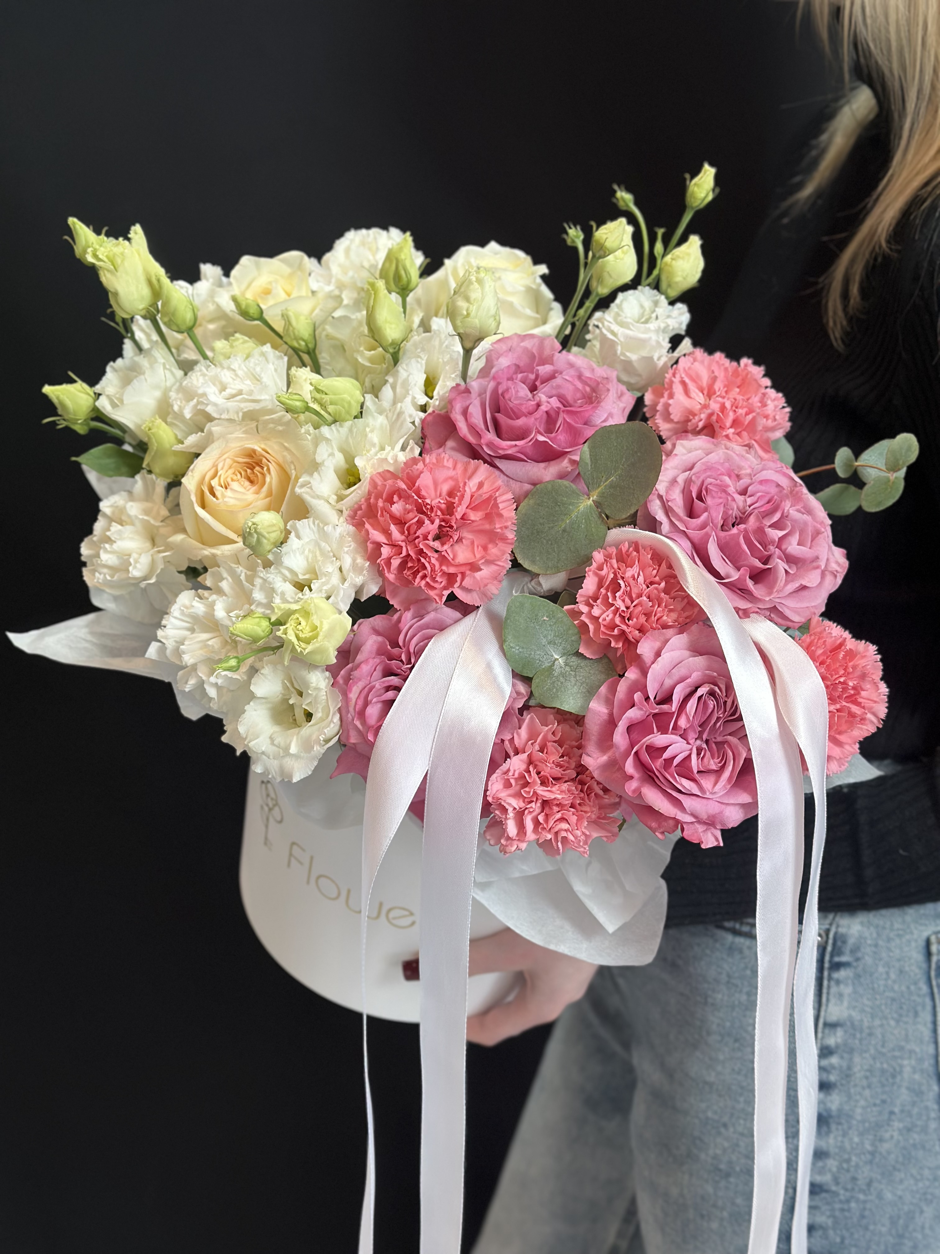 «Прованский сад» | Пышная композиция из роз, гвоздик и эустом с эвкалиптом