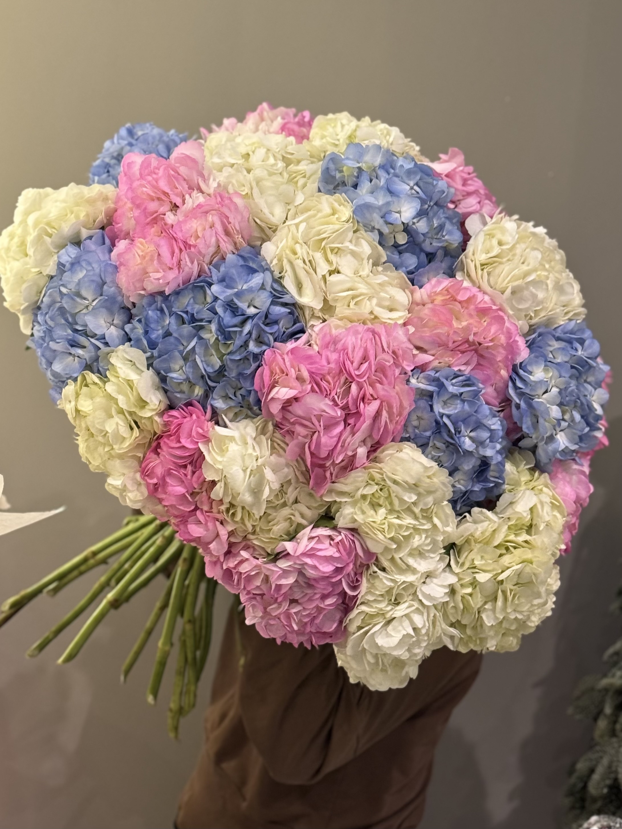 Гортензия — единственный цветок, который умеет менять цвет в зависимости от почвы. На кислой она синеет, на щелочной розовеет. В этом букете мы собрали все возможные оттенки, которые только бывают у гортензий: от почти прозрачно-голубого до насыщенно-розового, от лавандового до сиреневого, от белого до зелёного.