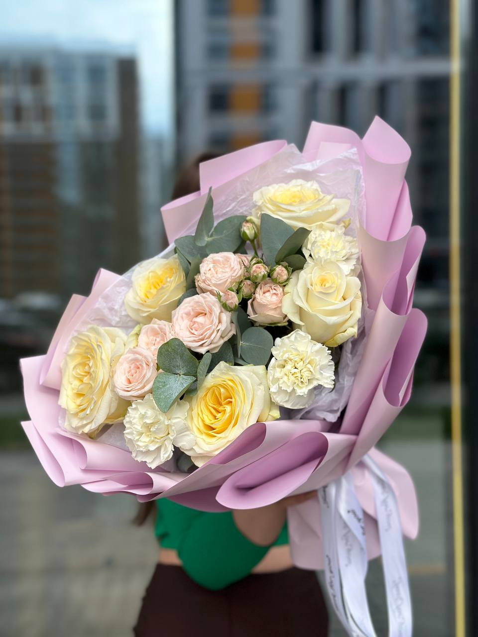 Есть особая магия в том, чтобы взять два проявления одного прекрасного цветка и соединить их в гармоничное целое. Этот букет — именно о такой магии. «Романс в двух частях» ведёт бесконечно красивый диалог между монументальной красотой и лёгким очарованием, между фокусом и фоном, между словом «люблю», сказанным уверенно, и тысячей намёков на счастье.