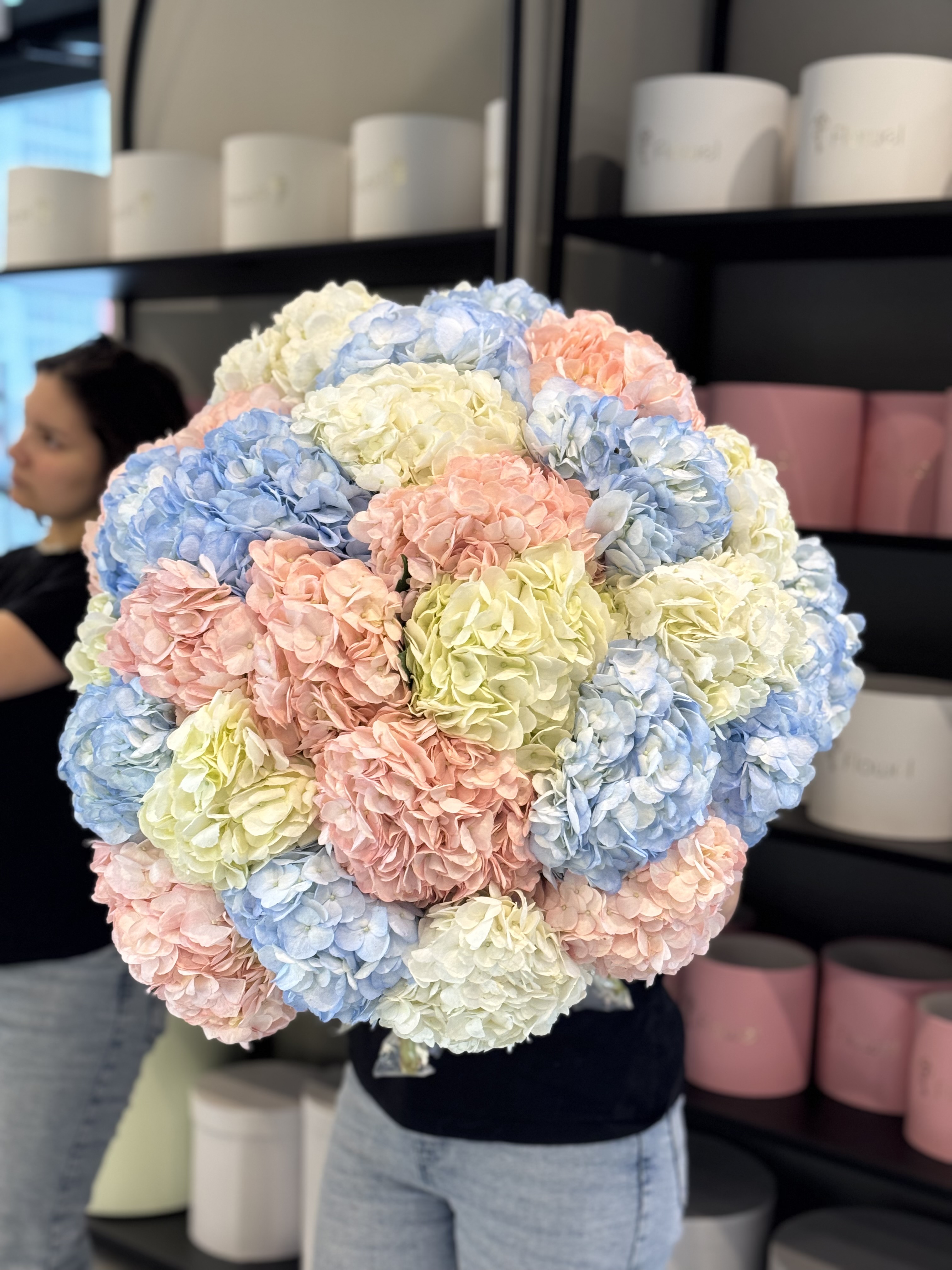 Букет «Три настроения» — 25 розовых, голубых и белых гортензий