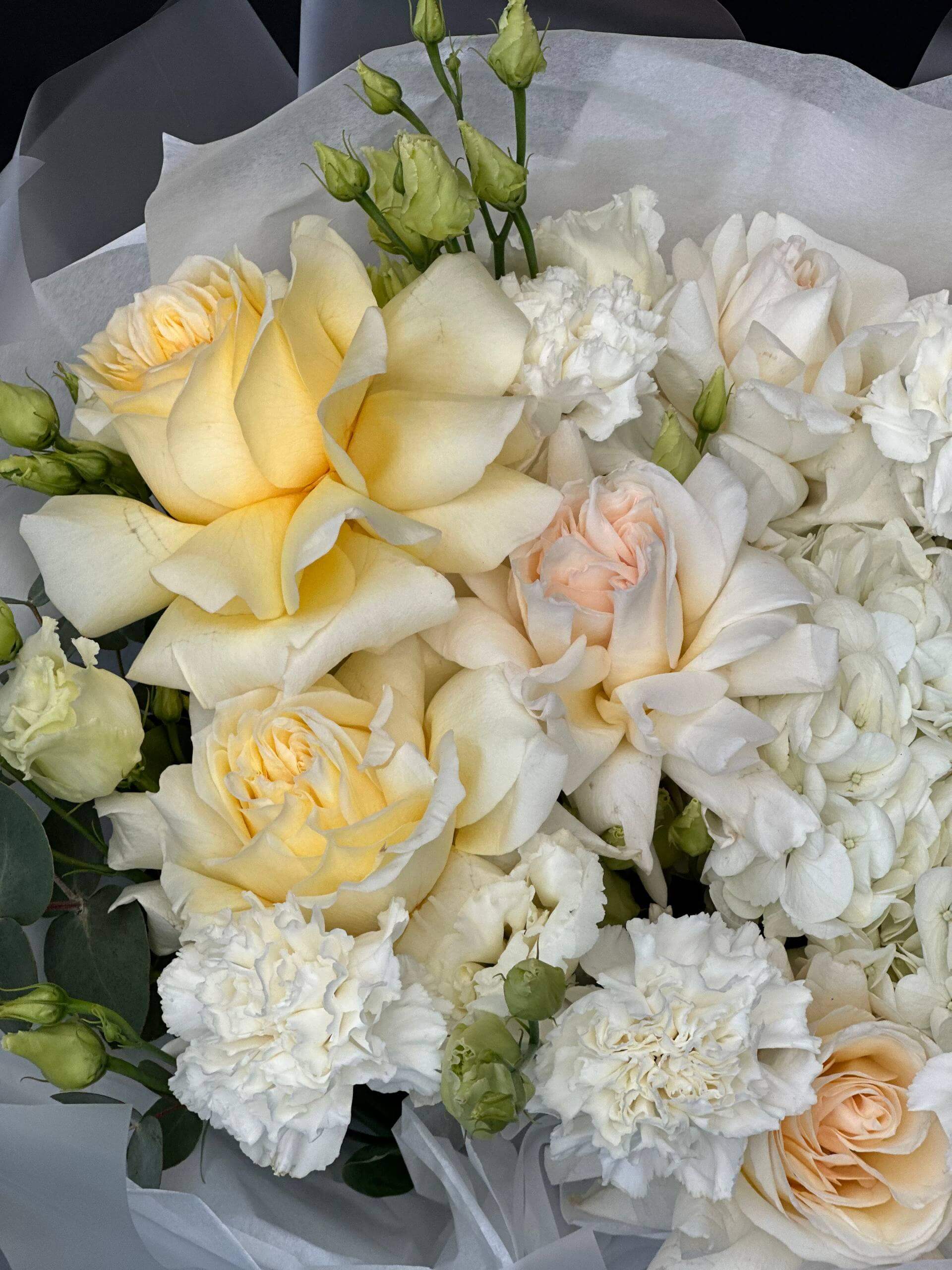Создать идеальный белый букет — большое искусство. Создать букет, который играет всеми оттенками белого, кремового и слоновой кости — искусство виртуозное. «Шепот нежности» — это именно такая работа. Он построен не на контрасте, а на тончайших переливах, где каждый цветок подобран так, чтобы подчеркнуть и оттенить благородство другого.